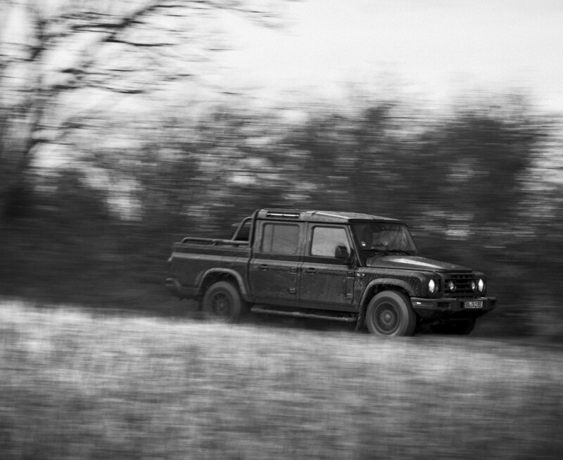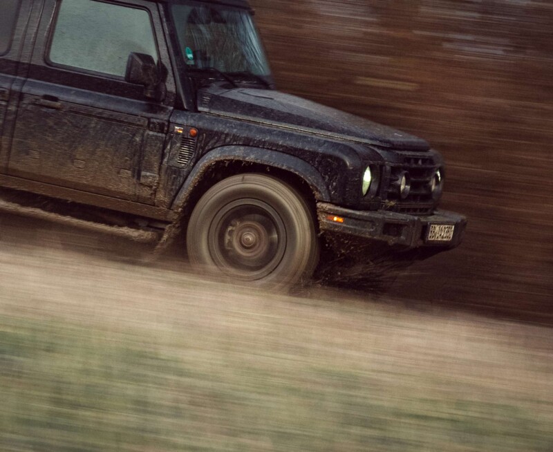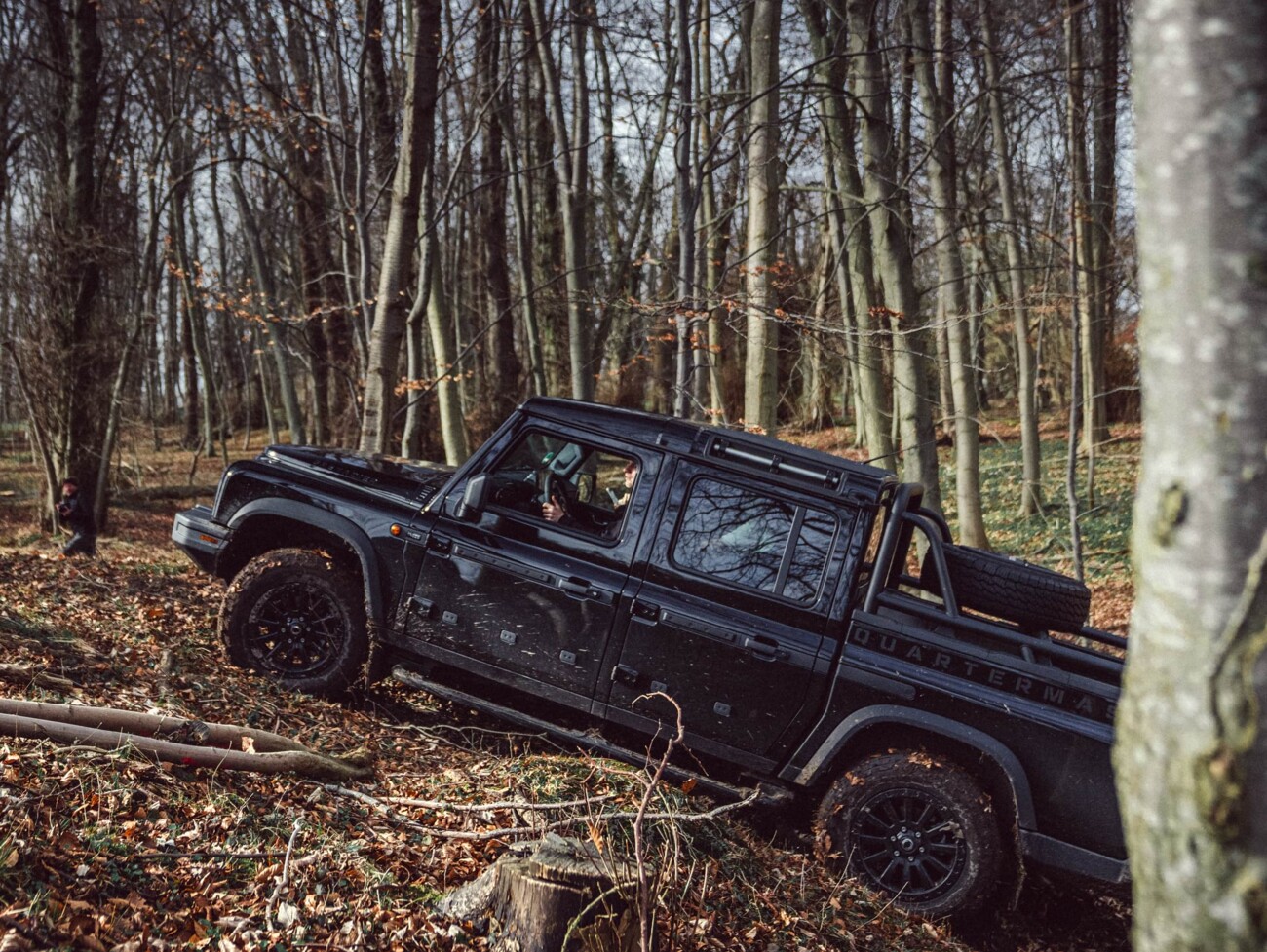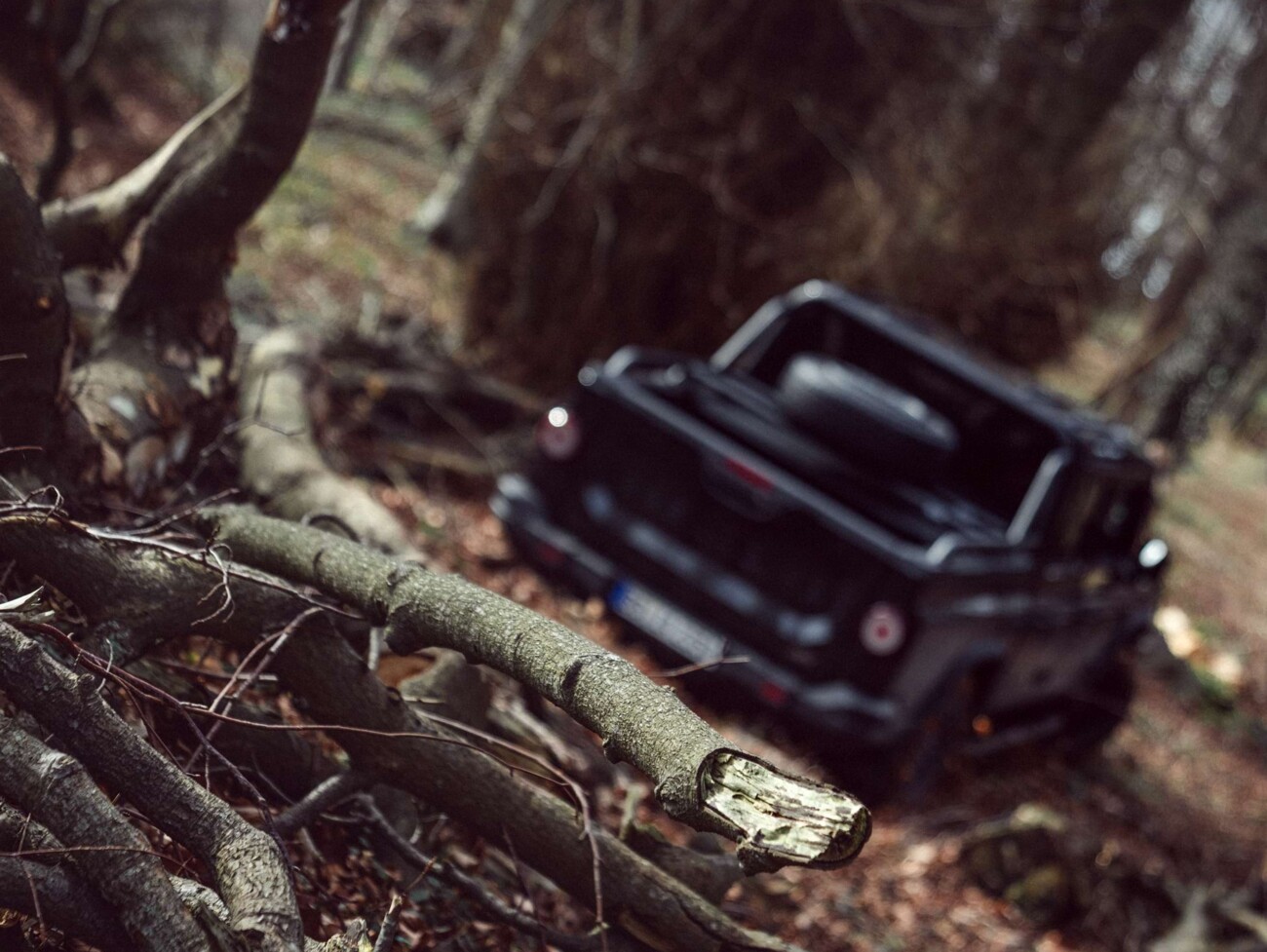 Wir biegen ein in den Wald. »Da runter«, meint Peschel nur. Okay. Mit viel Fantasie lässt sich so etwas wie ein Weg zwischen den Bäumen finden. Der Grenadier zieht langsam seine Bahn durch den Wald. Doch dann halten wir an. »Was ist los«, fragt Peschel. Gute Frage. Ich sage ihm, dass das hier für mich wie eine Sackgasse aussieht und ob ich hier vielleicht besser wenden und zurück sollte. Peschel deutet mit dem Arm direkt nach vorne, den Hügel hinauf, zwischen den stattlichen Stämmen von Laubbäumen hindurch, was so viel bedeuten soll wie: da entlang! Mehr als ein: »Ah ja, wenn man den Weg vor lauter Bäumen nicht mehr sieht …« fällt mir nicht ein. Peschel instruiert: »Halte dich hier leicht rechts, dann nach links oben ziehen.« - »Und wieder konstant Gas?« Peschel nickt. Dann erwähnt er beiläufig, dass wir bei der Bereifung nicht das grobe Stollenwerk für hartes Offraod drauf haben, sondern die straßenoptimierte Kompromiss-Variante. »Aber das macht nichts.« Soso.