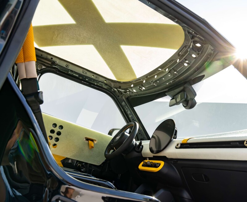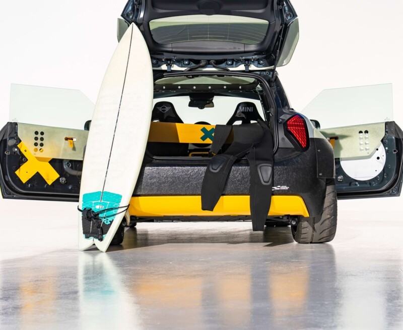 Das Showcar ist elektrisch, gelb-silbern lackiert und mit Surf-DNA aufgeladen. Fiberglas-Elemente sorgen für Leichtigkeit, Befestigungsgurte auf dem Dach erinnern an Spanngurte für Surfboards, und der Flex-Tip-Surf-Spoiler verhält sich wie die Unterseite eines Surfboards – Aerodynamik pur. Der Innenraum schafft auch eine haptische Verbindung zur Surfkultur: Fiberglas-Tabletts für Wetsuits, wasserabweisende Neoprenpolsterung, langlebiger Sisal-Boden – alles funktional, flexibel, intuitiv.