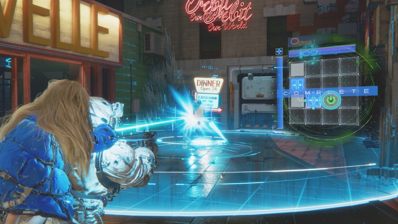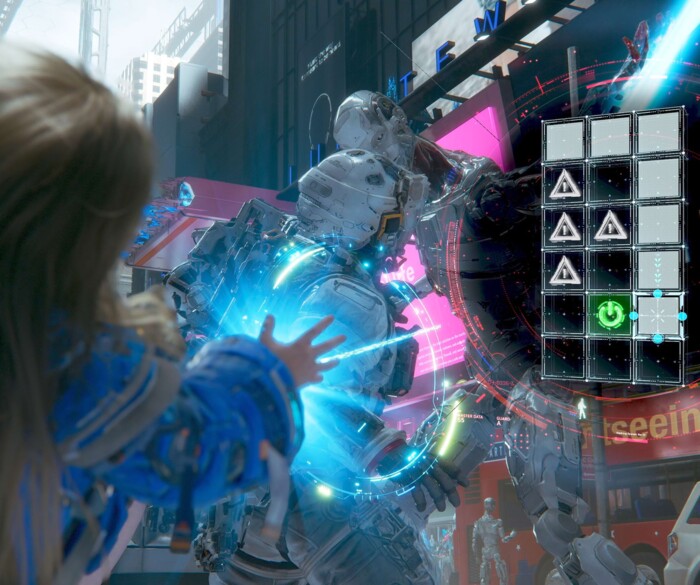 Spielerisch geht »Pragmata« einen ungewöhnlich Weg und verlangt Aufmerksamkeit auf mehreren Ebenen zugleich. Während Hugh mit seiner Standardwaffe, schweren Geschützen und unterstützenden Tools wie Täuschungsmanövern oder Stasis-Effekten das Schlachtfeld kontrolliert, öffnet Diana im Hintergrund die eigentlichen Angriffsfenster. Ihre Hacks laufen über ein Puzzle-System in Echtzeit, bei dem Sie Wege durch ein Symbol-Labyrinth legen, Module aktivieren und gegnerische Panzerungen aufbrechen. Erst dann richten Schüsse wirklich Schaden an.