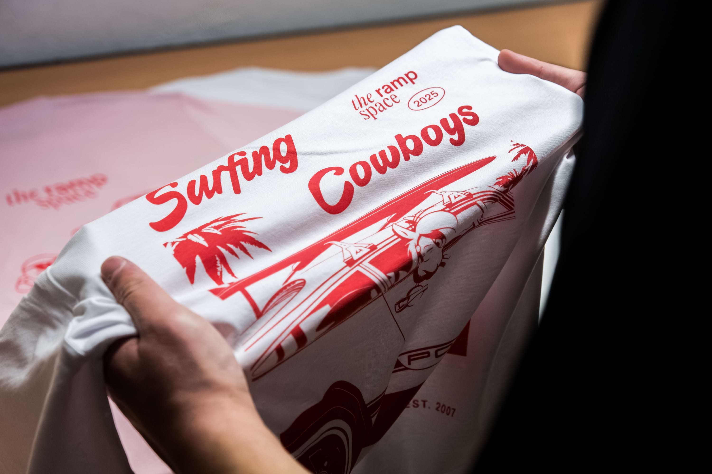 Oscar Wilde sagte einmal: »Man sollte entweder ein Kunstwerk sein oder ein Kunstwerk tragen.« Wir sagen: Wieso nicht gleich beides? Mit der exklusiven »the space Collection« zur Eröffnung von the ramp space wird genau das möglich. Zum Beispiel mit dem lässigen »Surfing Cowboys« T-Shirt.