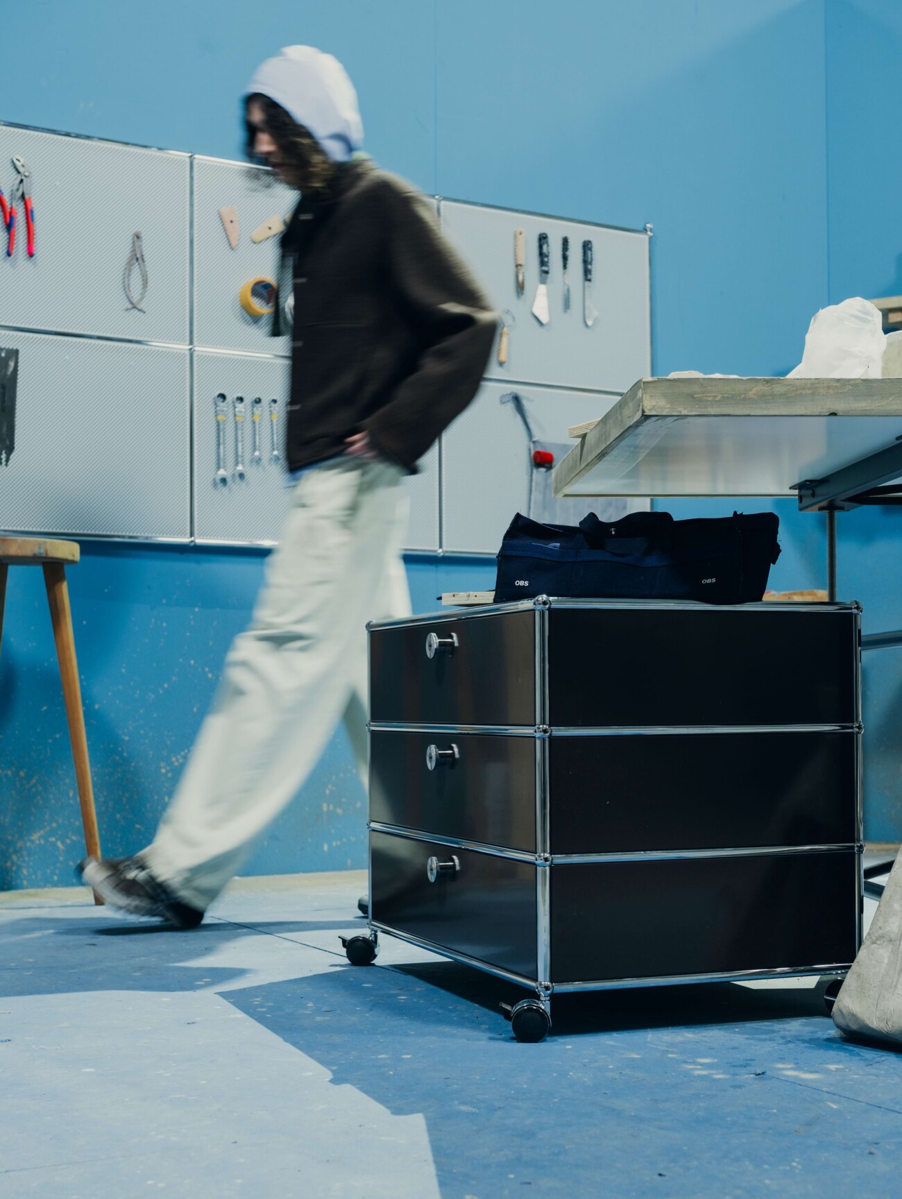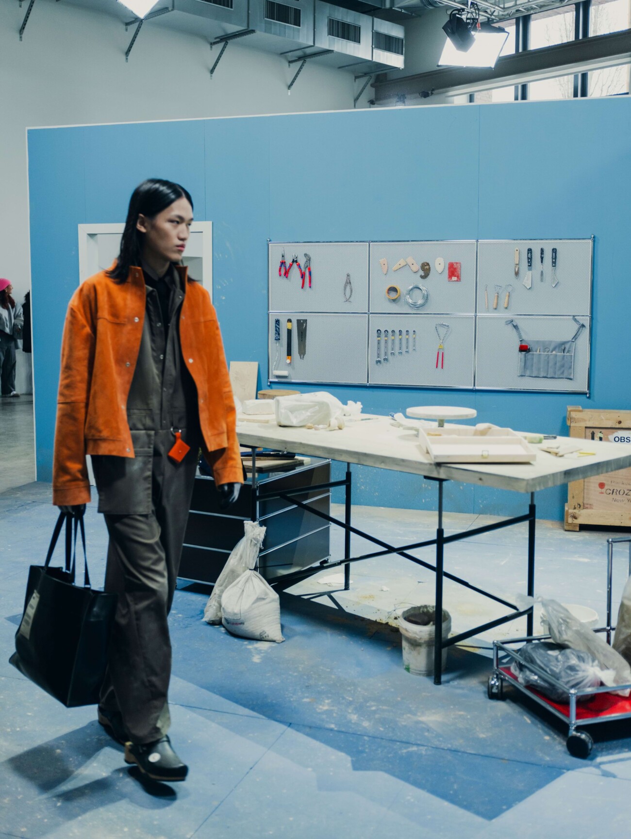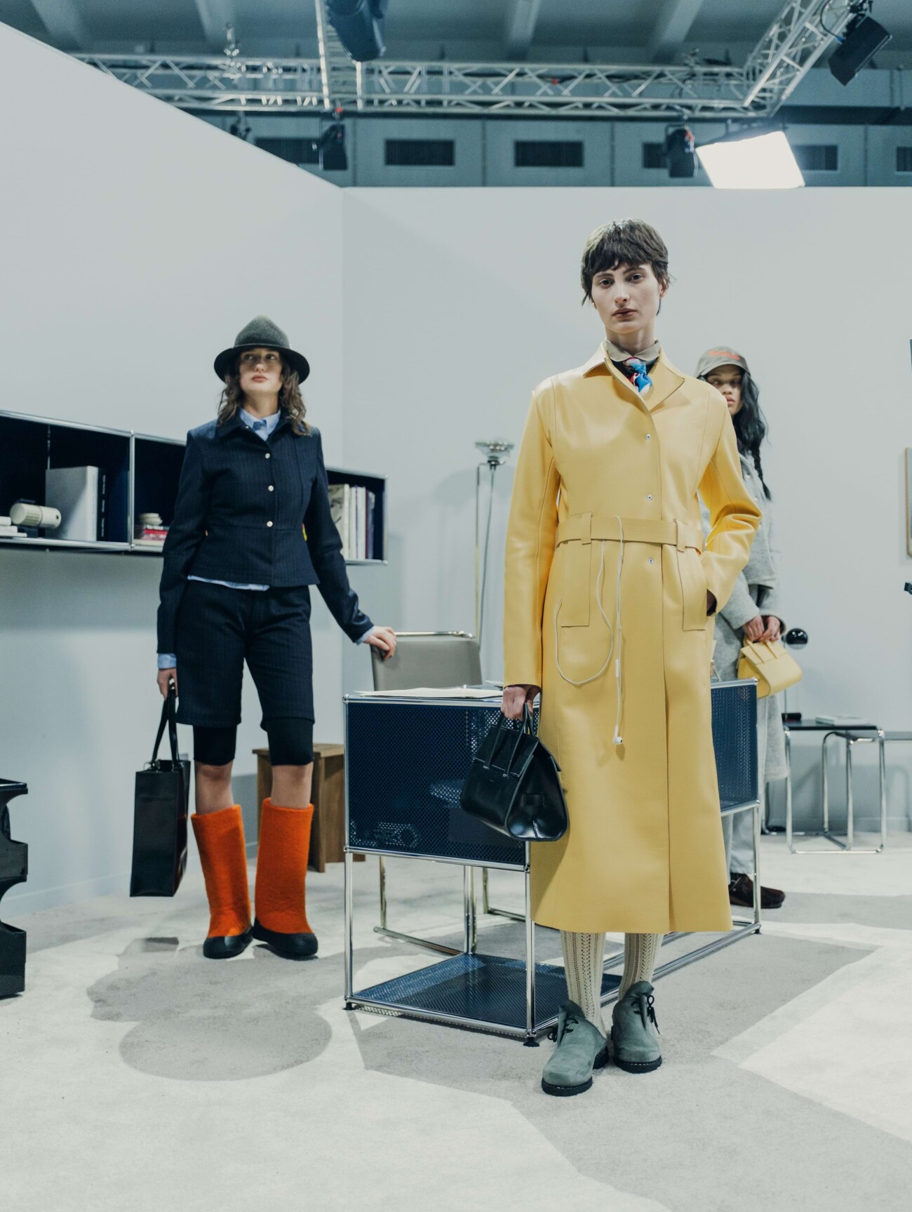 As part of the "Ring the Bell" collection, the two long-standing partners William Fan and USM Haller presented a walk-through catwalk at KW Institute for Contemporary Art, which translated the label's familiar retail experience into the context of the show. Specially designed USM furniture became a central part of the staging and offered a hybrid environment between catwalk, exhibition and retail space.