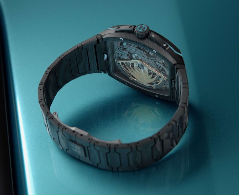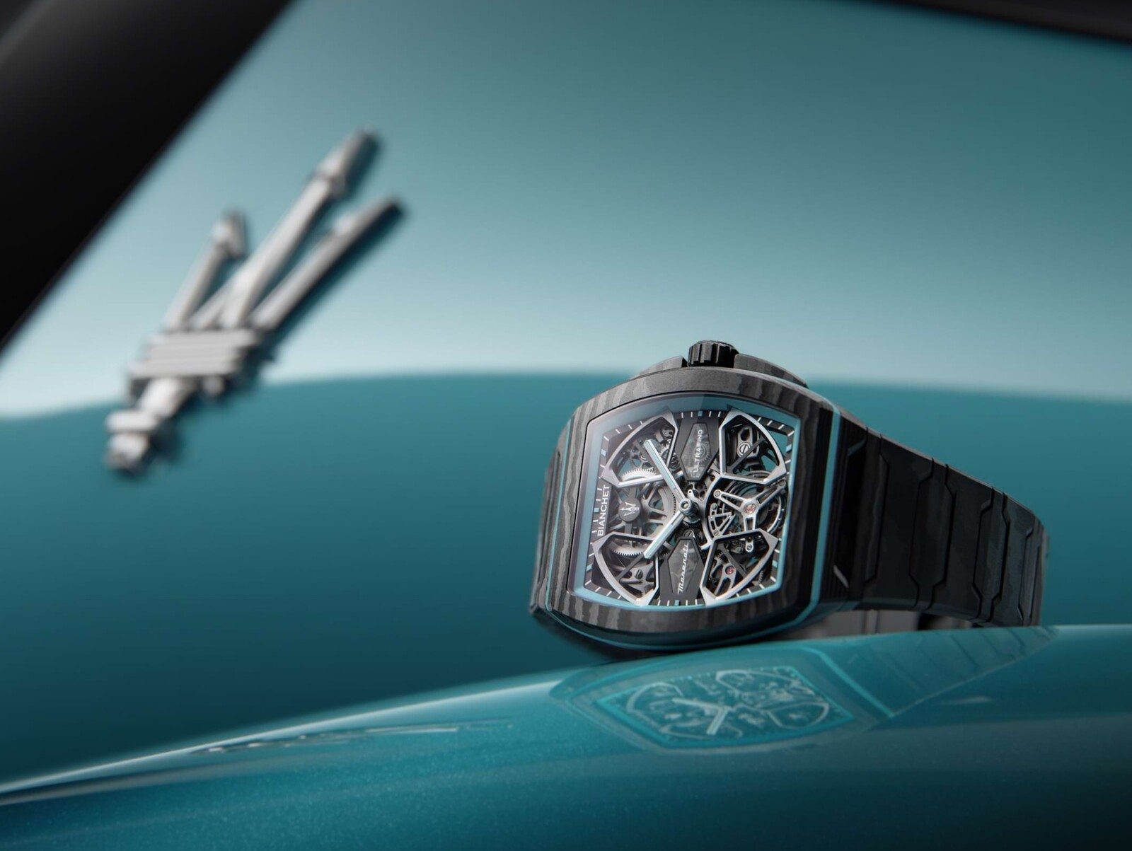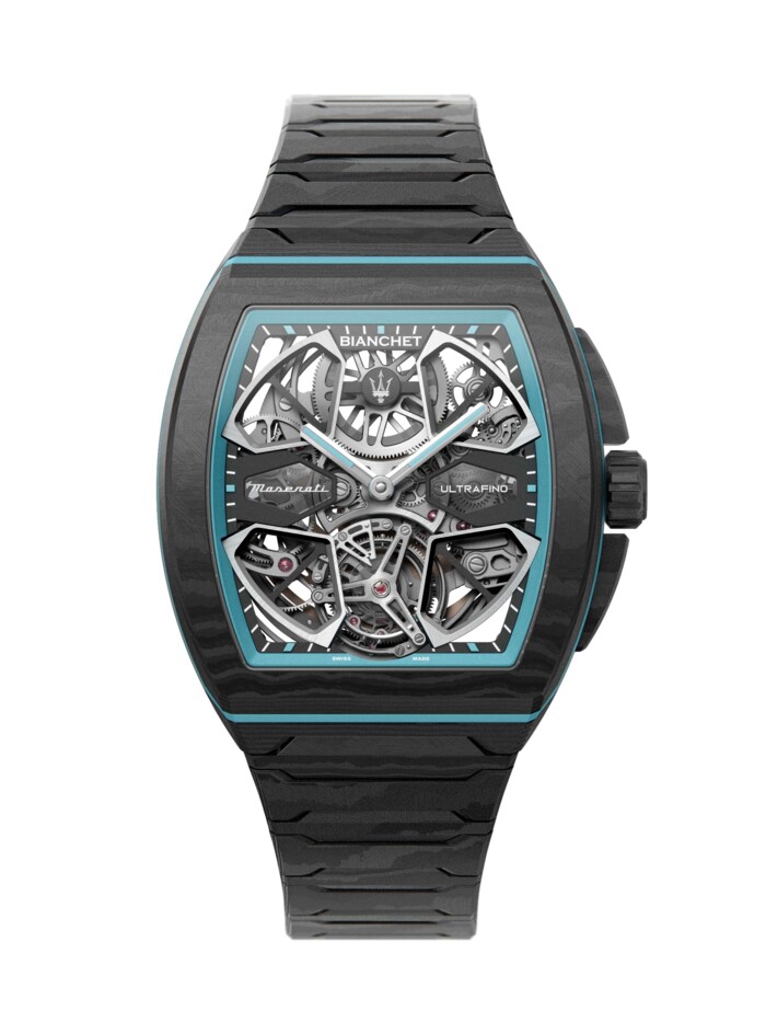The UltraFino also follows a consistent performance logic in terms of materials: titanium for the movement structure, high-density carbon fibre for the case and bracelet. They reflect the torsional rigidity of the carbon chassis of the MCPURA, while the flying tourbillon cage - visible and floating - is reminiscent of the beating heart of the Nettuno V6 engine. The centrepiece is the Bianchet UT01 calibre: with a height of just 3.85 millimetres, it is one of the most remarkable ultra-thin tourbillon movements in its class. A newly conceived construction, including a free-floating barrel, enables a power reserve of 60 hours despite its extreme slenderness.