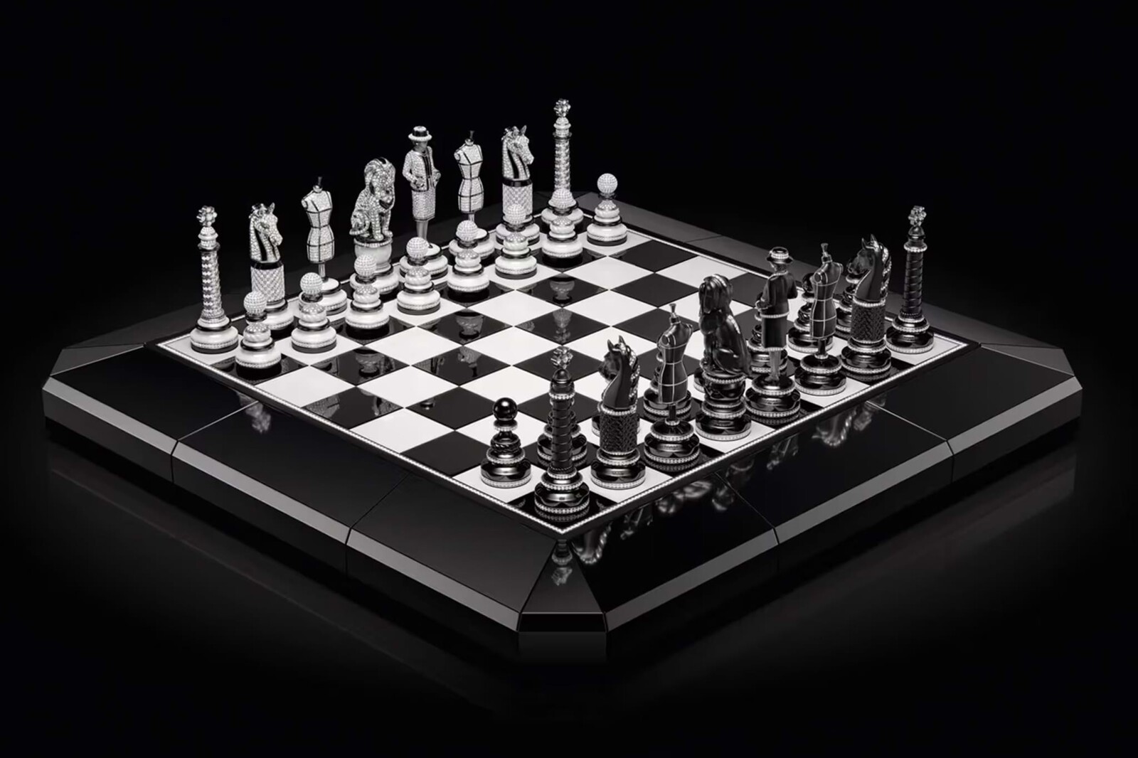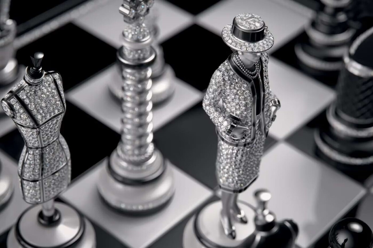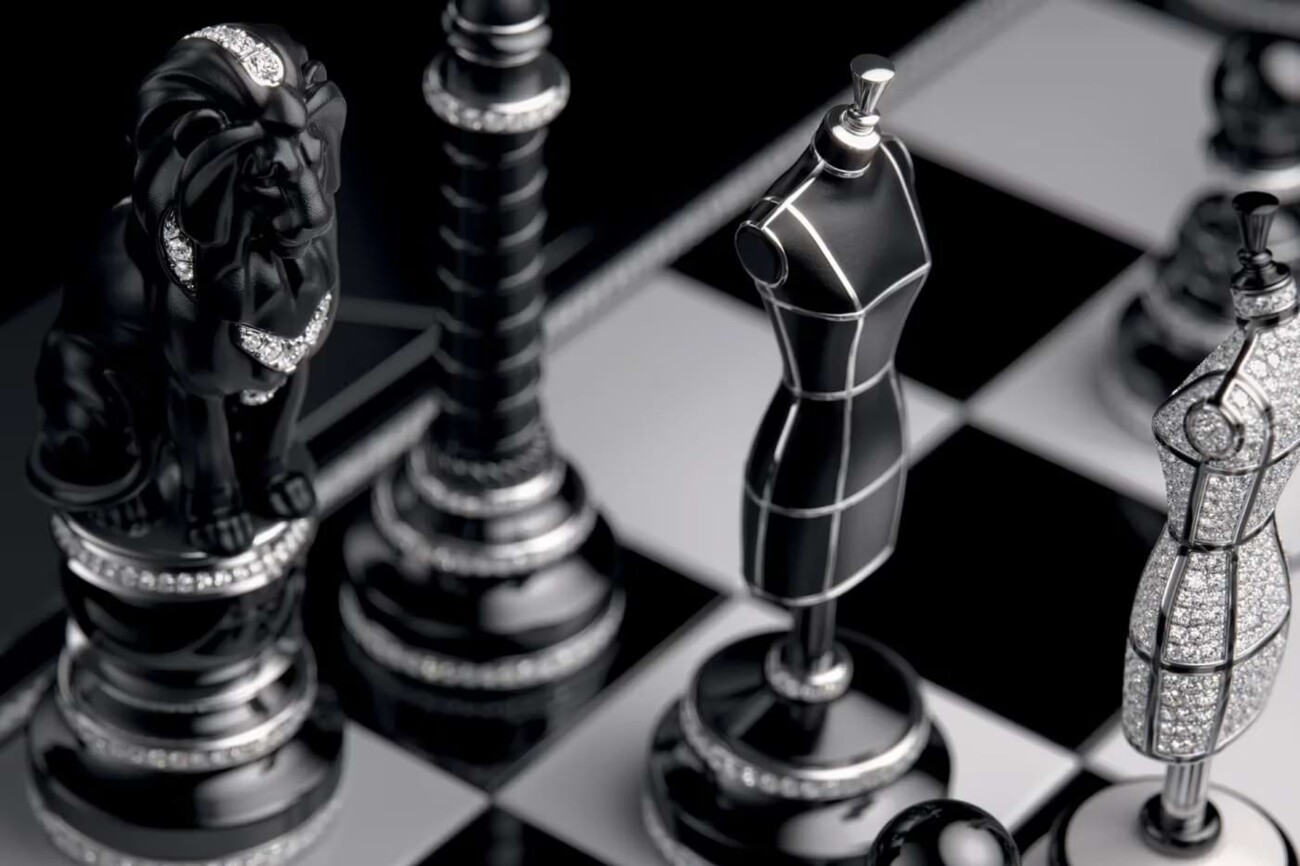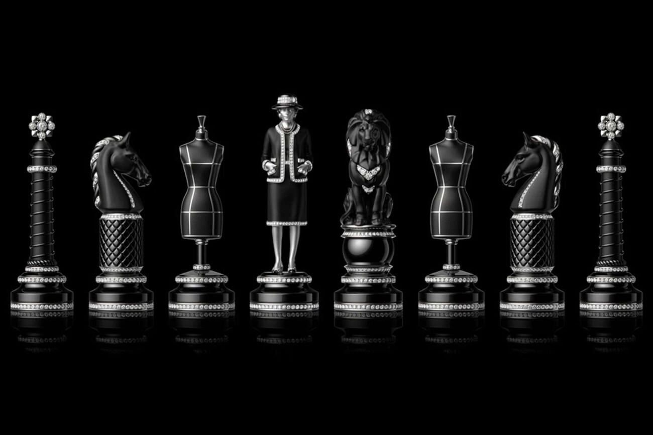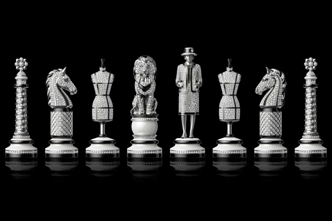 The base of the board is made of obsidian, the playing field itself is made of black and white ceramic, framed by sparkling diamonds. The 32 individually designed pieces take up iconic symbols of the Maison, including the Place Vendôme column and a lion king. The most powerful figure on the board, the Queen, is of course Gabrielle Chanel herself – in a diamond-studded tweed costume.
